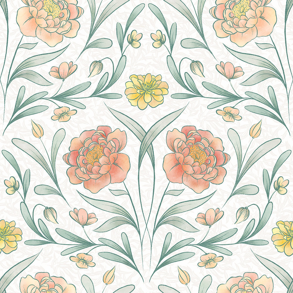 Vintage Trellis is an artistic palette of silt green, peach and yellow. This vintage floral wallpaper blends spring colours to naturally uplift any home interior. Perfectly paired with elegant fabrics, this heritage design creates an effortlessly timeless style. Contrast rich greens and golden hues to draw out the springtime colourway.