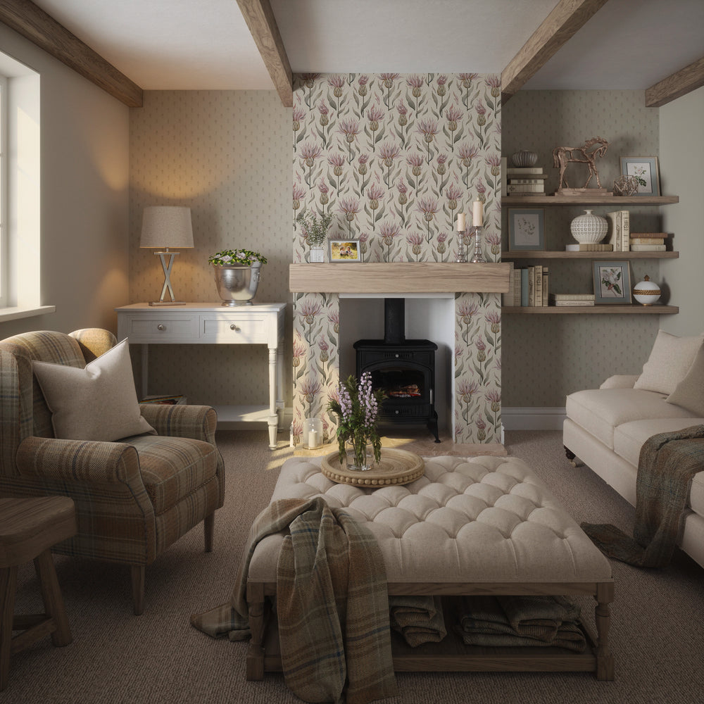 Embodying the allure of the Highlands, our Wee Thistle wallpaper marries rugged sophistication and delicate charm. Daintily rendered miniature stone-hued thistles dance across a canvas of vintage cream to create a wonderful accent that complements our Thistle Royal wallpaper. Wee Thistle works well in living spaces and bedrooms, and its understated hues evoke quiet serenity, like the ancient stones of Highland castles amidst the heather-clad hills. Coordinate Wee Thistle with the larger blooms of its bigger sibling, Thistle Royale to create a cohesive look that captures the essence of the Scottish countryside. Introduce pops of colour with furnishings like tartan throws and vibrant cushions.